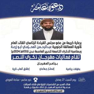 اللجنة التحضيرية لمهرجان ذكرى النصر تدعو أبناء عدن لحضور الإفطار الجماعي في ساحة العروض
