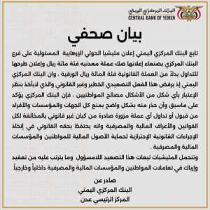 عاجل : البنك المركزي بعدن يجدد تحذيره من تداول أي عملة صادرة عن فرع صنعاء كونها مزورة