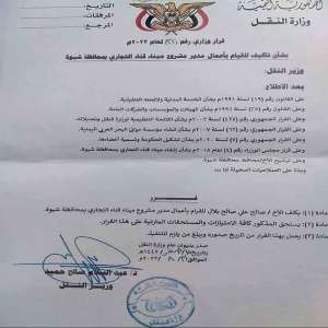 وزير النقل يصدر قرار بتكليف صالح علي بلال مديرا لمشروع ميناء قناء التجاري