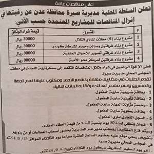 محلي صيرة بعدن يعلن إنزال ( 4 ) مناقصات