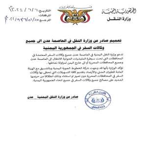 تعميم هام وعاجل عن وزارةالنقل إلى جميع وكالات السفر في الجمهورية اليمنية