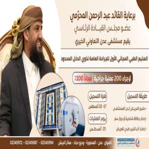 غدًا الأحد.. تدشين العمليات الجراحية في المخيم الطبي المجاني بمستشفى عدن التعاوني برعاية القائد المحرّمي
