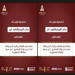 بدء صرف مرتبات التربية والتعليم في محافظتي لحج وأبين عبر بنك عدن الإسلامي للتمويل الأصغر