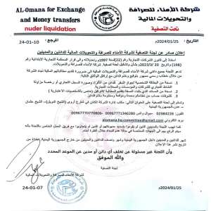 إعلان هام من لجنة تصفية شركة الأمناء للصرافة والتحويلات المالية
