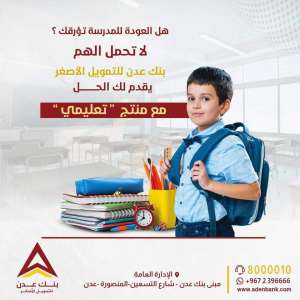 بنك عدن للتمويل الأصغر يطلق خدمة سداد الرسوم الدراسية وتوفير مستلزمات الدراسة