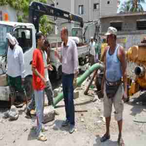 فرق مختصة تقوم بإصلاح أنبوب رئيسي للصرف الصحي بوضع وموقع خطير أسفل مبنى عشوائي في عدن