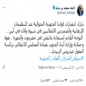 اللواء بن بريك يبارك انتصارات القوات الجنوبية ضد التنظيمات الإرهابية