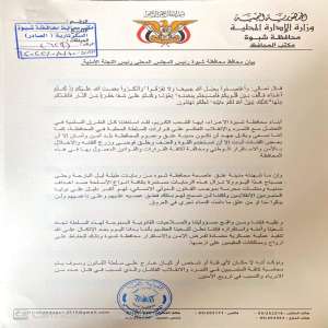 عـــاجل.. محافظ شبوة يعلن بدء عملية عسكرية للقضاء على المتمردين وحفظ الأمن والاستقرار في المحافظة
