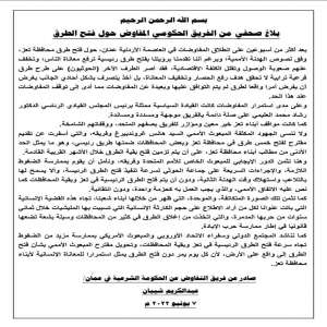 عاجل.. بلاغ صحفي صادر عن الفريق الحكومي المفاوض حول فتح طرق تعز