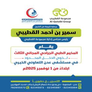 برعاية الشيخ سمير القطيبي.. مستشفى عدن التعاوني الخيري يعلن انطلاق المخيم الطبي الجراحي المجاني الثالث