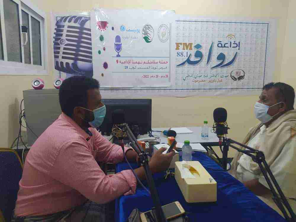 استضافة اذاعة روافد محافظة حضرموت الاستاذ القدير فؤاد بامطرف مدير الرعاية الصحية والتحصين الصحي بساحل حضرموت ضمن حملة سلامتكم تهمنا ٩ الإذاعية الذي ينفذها البرنامج العام لإعلام المرأة والطفل بالشراكة مع برنامج C4D باليونسيف منظمة الطفولة.