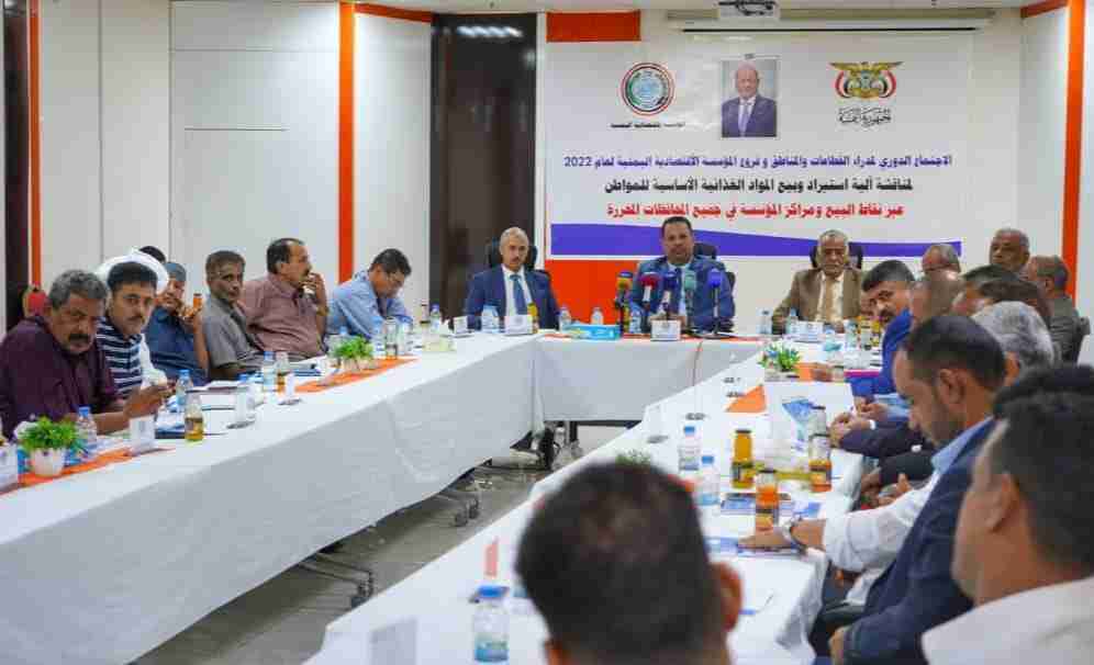 ناقش اجتماع موسع لقيادات المؤسسة الاقتصادية، آلية استيراد وبيع المواد الغذائية الأساسية للمواطنين عبر نقاط البيع ومراكز المؤسسة في جميع المحافظات المحررة.
