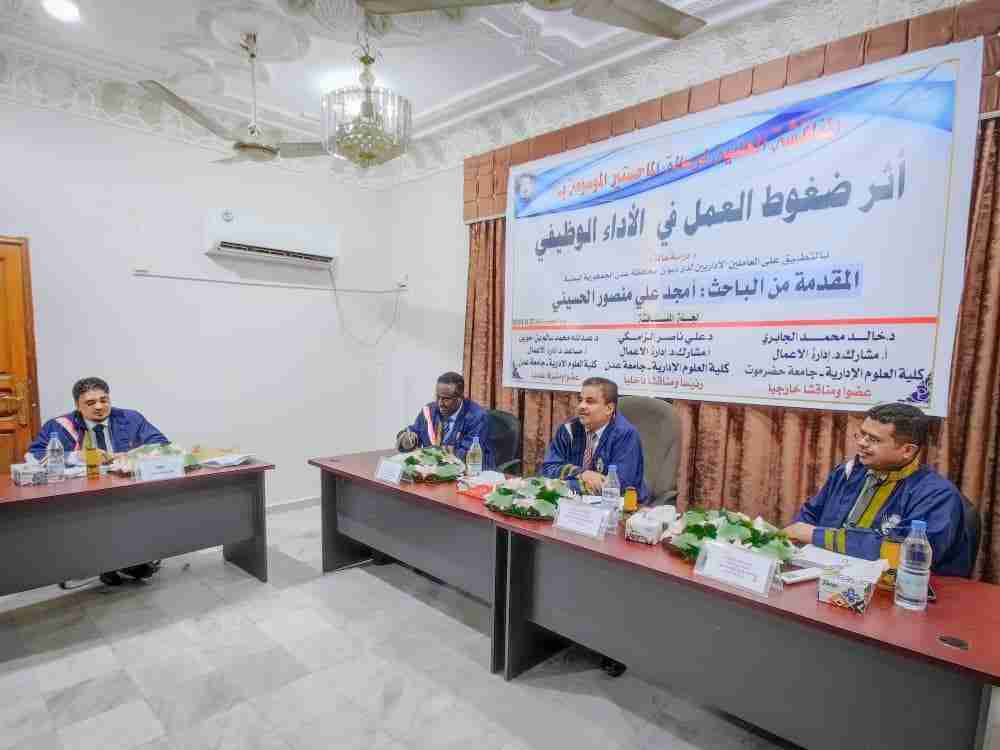 وناقش الباحث الحسيني، اليوم الخميس، أطروحته الموسومة ب "أثر ضغوط العمل في الأداء الوظيفي" دراسة حالة [ العاملين الإداريين لدى ديوان محافظة عدن].