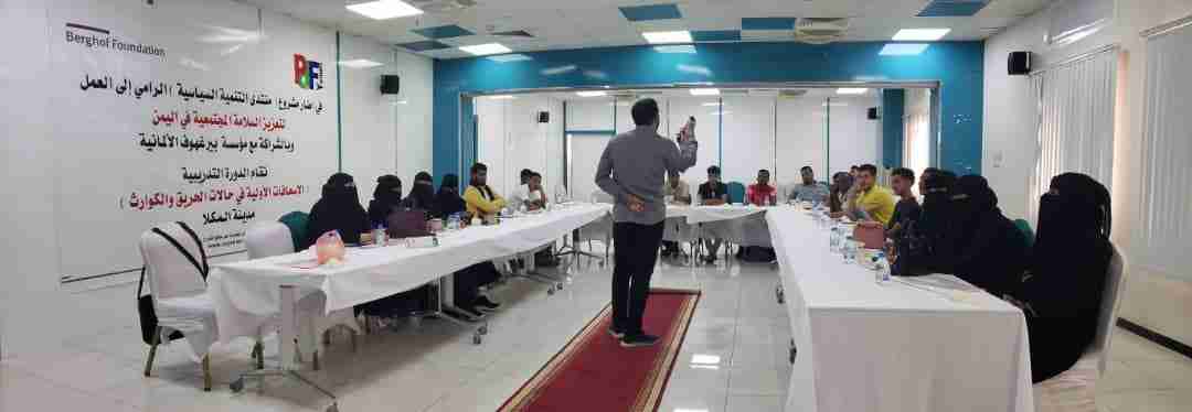 في إطار مبادرة فريق لجنة السلامة المجتمعية ضمن مشروع تعزيز السلامة المجتمعية الذي ينفذه منتدى التنمية السياسية والرامي إلى العمل لتعزيز السلامة المجتمعية في اليمن وبالشراكة مع مؤسسة بيرغهوف الألمانية تنفذ الدورة التدريبية النوعية تحت عنوان "الإسعافات الأولية في حالات الحرائق والكوارث".