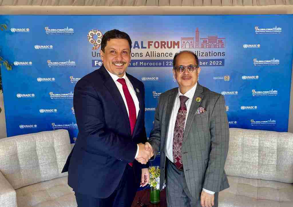 بحث وزير الخارجية وشؤون المغتربين الدكتور أحمد عوض بن مبارك، مع نائب وزير الخارجية الهندي الدكتور أوصاف سعيد، العلاقات الثنائية بين البلدين الصديقين والسبل الكفيلة بتعزيزها وتطويرها، وذلك على هامش المشاركة في المنتدى العالمي التاسع لتحالف الأمم المتحدة للحضارات.