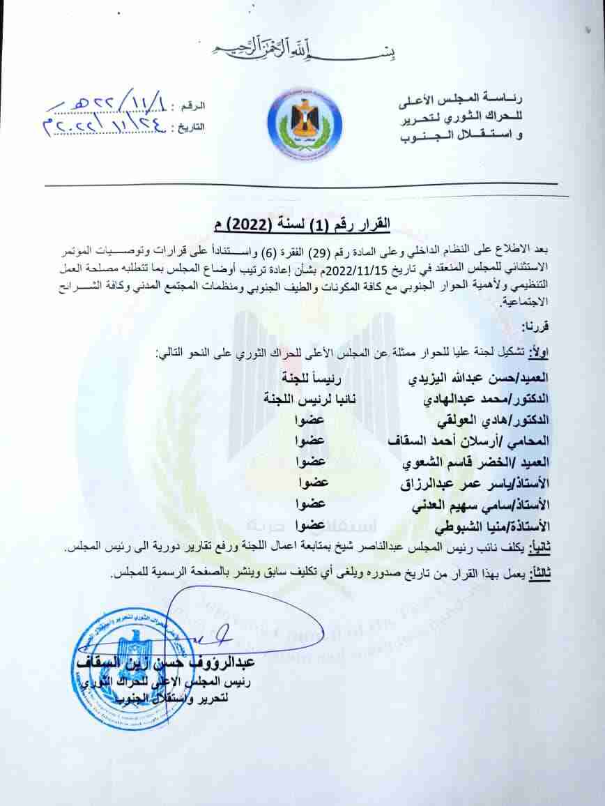 اصدر الأستاذ/ عبدالرؤوف زين السقاف رئيس المجلس الاعلى للحراك الثوري لتحرير وإستقلال الجنوب القرار رقم "1" بشأن لجنة الحوار التابعة للمجلس.