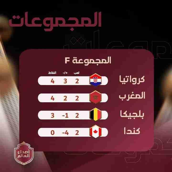 وبالتالي، تصدّرت كرواتيا المجموعة السادسة مع 4 نقاط أمام المغرب الذي يملك الرصيد نفسه ولكن بفارق هدف أقل، بعدما فاز «أسود الأطلس» في وقت سابق على بلجيكا الثالثة مع ثلاث نقاط (2-0)، فيما تقبع كندا أخيرة خالية الوفاض.