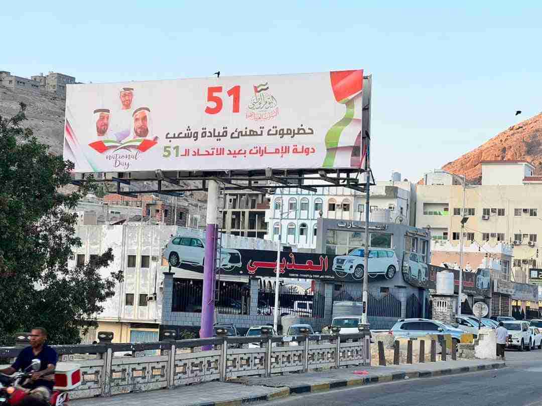 ضمن الحملة الشعبية لشكر دولة الإمارات في حضرموت، لمشاركة الأشقاء الإماراتيين احتفالاتهم باليوم الوطني "عيد الإتحاد 51"، تم نصب لوحات عملاقة في مديريات ”المكلا - والشحر - وغيل باوزير“ تعبر عن الشكر والتقدير للدور الإماراتي الكبير في حضرموت .