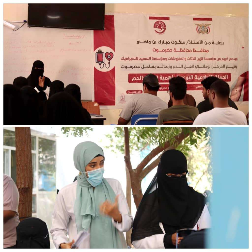 نفذ منتسبوا المركز الوطني لنقل الدم وأبحاثه بساحل حضرموت، اليوم في المكلا، الحملة التوعوية بأهمية التبرع بالدم، تحت رعاية محافظ حضرموت مبخوت بن ماضي وتمويل مؤسستي الزين للأثاث والمفروشات والسعيد للسيراميك.