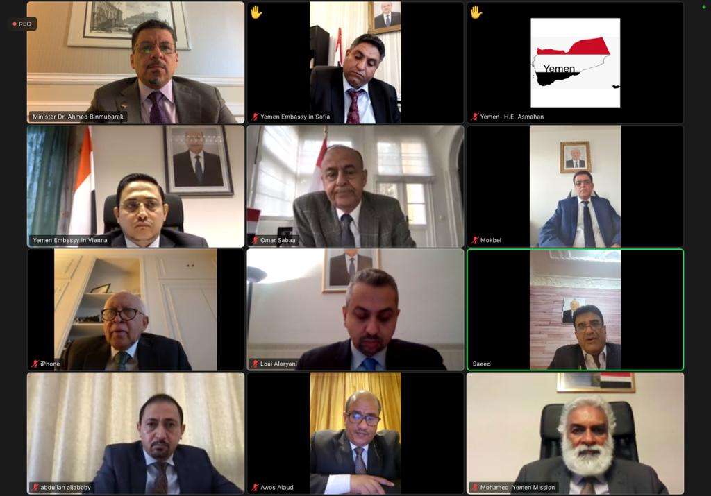 ترأس وزير الخارجية وشؤون المغتربين الدكتور أحمد عوض بن مبارك، اليوم، عبر تقنية الاتصال المرئي، اجتماع لرؤساء البعثات الدبلوماسية اليمنية في اوروبا.