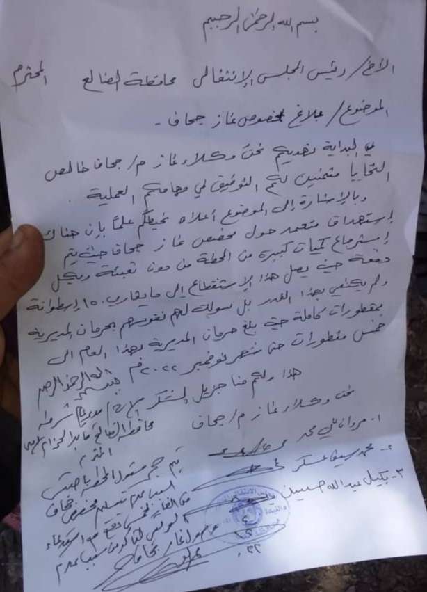 وفي بلاغ رفعه الاخوة مروان علي محمد ومحمدسيف عسكروبكيل عبدالله حسين وكلاء الغاز بالمديرية لقيادة المجلس الانتقالي بالمحافظة ومديرعام مديرية جحاف