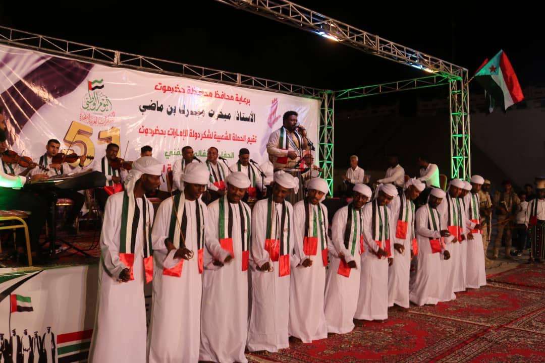 برعاية كريمة من محافظ محافظة حضرموت الاستاذ مبخوت مبارك بن ماضي نظمت الحملة الشعبية لشكر دولة الإمارات في حضرموت، فعالية احتفائية وحفل كرنفالي وفني، مساء أمس الجمعة، بساحة خور المكلا، وأطلقت في بدايتة الألعاب النارية، بمناسبة اليوم الوطني الإماراتي "عيد الإتحاد 51"، وتعبيرا عن وفاء الحضارم وعرفناهم بالمواقف البطولية والإنسانية لدولة الإمارات، تجاه أبناء حضرموت .