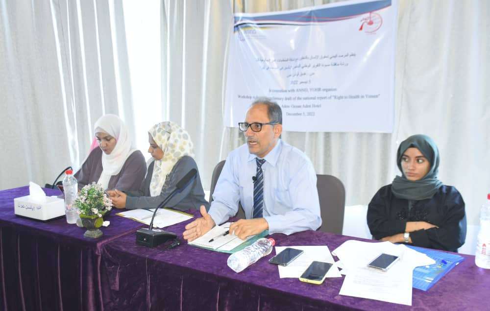 نظم المرصد اليمني لحقوق الإنسان (YOHR) بالتعاون مع شبكة المنظمات العربية غير الحكومية للتنمية (ANND) يوم أمس الإثنين ٥ ديسمبر ٢٠٢٢، بفندق أوشن عدن بمديرية خور مكسر ورشة مناقشة مسودة التقرير الوطني حول الحق في الصحة باليمن، وذلك في إطار تقرير الراصد العربي السنوي الذي يضم عدد من التقارير النوعية لمناقشة مواضيع عدة لعدد من الدول العربية، بمشاركة (٢١) مشاركاً ومشاركة من وزارة الصحة العامة والسكان وممثلي منظمات المجتمع المدني المحلية وممثلين عن المنظمات الدولية وممثلي الشبكة بالعاصمة بيروت عبر برنامج الزووم الإلكتروني (ZOOM).