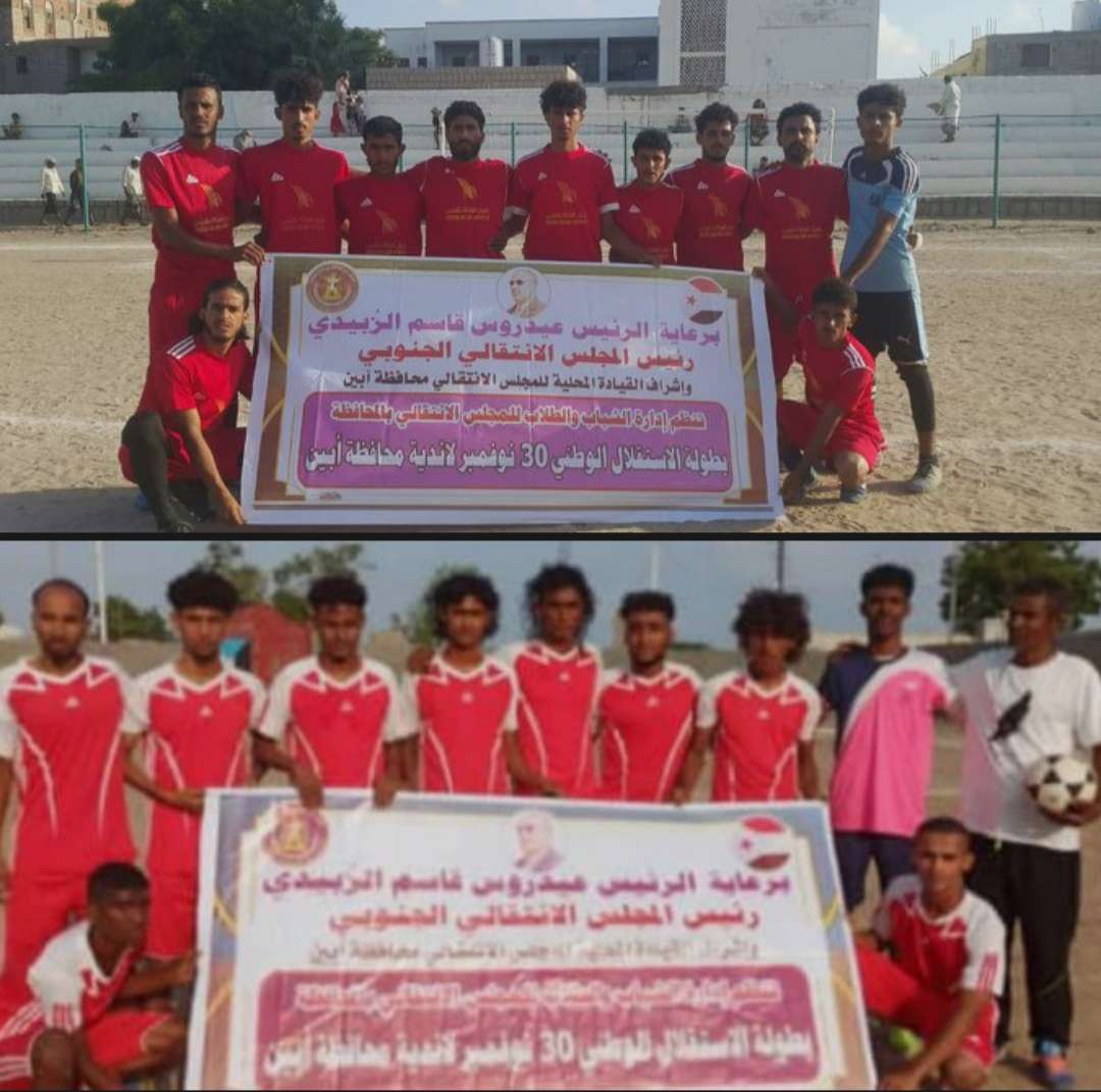 يسدل الستار عصر الخميس القادم على كأس بطولة الاستقلال لاندية أبين في لقاء قوي ومثير يجمع ناديي حسان والحضن في ختام مباريات الدوري ،الذي اقيم برعاية من الرئيس عيدروس الزبيدي رئيس المجلس الانتقالي الجنوبي، واشراف انتقالي أبين ، وتنظيم ادارة الشباب والطلاب بانتقالي المحافظة ، الذي شارك فيه 22 نادي قسمت إلى أربعة تجمعات .
