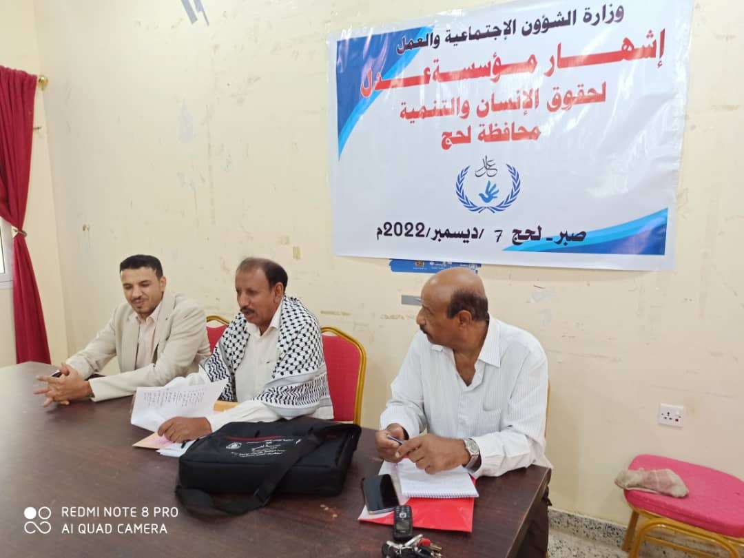 تم صباح اليوم الاربعاء الاشهار عن "مؤسسة عدل لحقوق الانسان والتنمية" ومقرها محافظة لحج تحت اشراف مندوب من وزارة الشئون الاجتماعية والعمل.