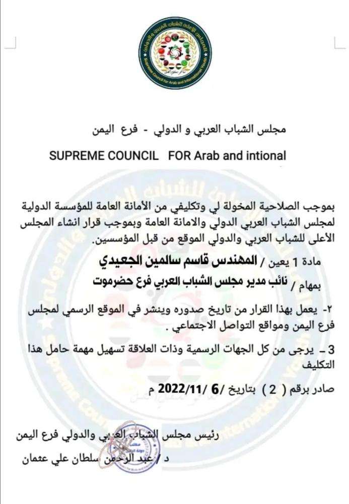 اصدر رئيس مجلس الشباب العربي والدولي فرع اليمن الدكتور عبدالرحمن سلطان علي عثمان قرار بتعين المهندس قاسم سالمين الجعيدي نائبا لمدير مجلس الشباب العربي فرع حضرموت نظير جهوده المثمرة وخبرته الواسعة في العمل الميداني الاجتماعي والتعليمي وافكار المتجددة في ثقافة المحبة والسلام.