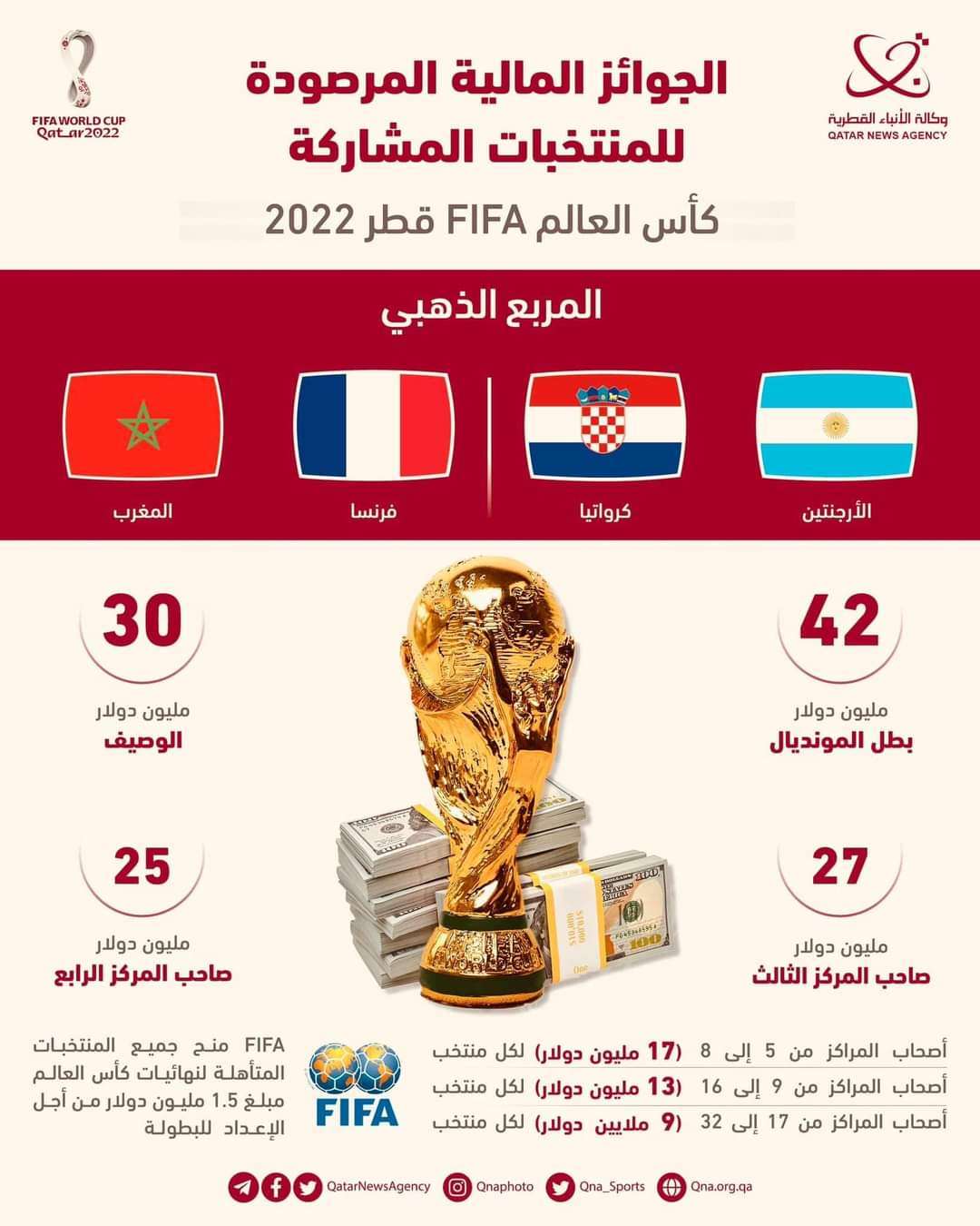 25 مليون دولار هي أقل ما سيحصل عليه المنتخب المغربي لو حل في المركز الرابع و42 مليون دولار لو نال لقب كأس العالم قطر 2022.