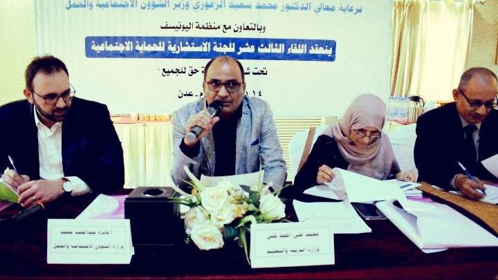 واستهل محمد علي لملس وكيل وزارة التربية والتعليم لقطاع التعليم العام اللقاء بنقل تحيات وزير الشؤون الاجتماعية والعمل رئيس اللجنة الاستشارية الدكتور محمد سعيد الزعوري لاعضاء اللجنة قائلا.. "نظرا لإنشغال معالي الوزير رئيس اللجنة الاستشارية للحماية الاجتماعية بمهام أخرى مهمة صادفت موعد انعقاد هذا اللقاء ، وكذلك غياب نائب رئيس اللجنة كونه في مهمة خارج البلد ومن حرص معالي الوزير رئيس اللجنة على ديمومة انعقاد اجتماعات ولقاءات اللجنة في الموعد المتفق عليه ، كلفني بإدارة هذا اللقاء آملا أن أوفق".