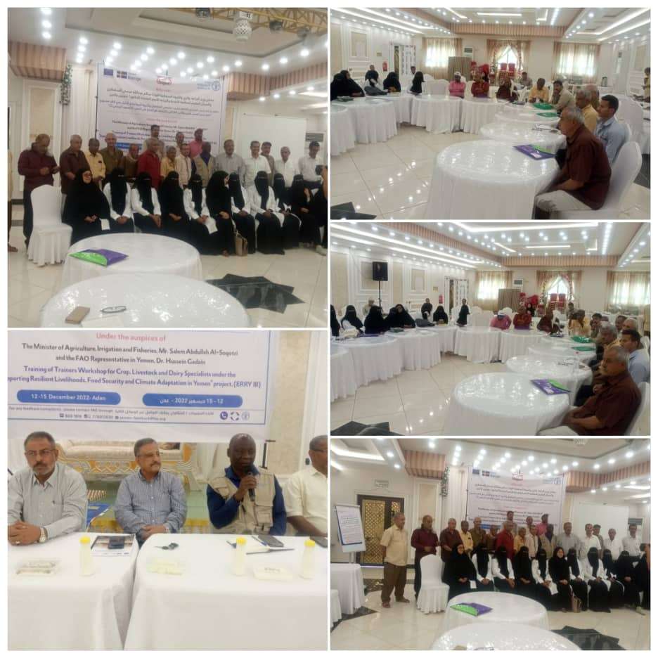 اختتمت صباح اليوم في العاصمة عدن الورشة التدريبية الخاصة بتدريب المدربين المختصين في المحاصيل والثروة الحيوانية والألبان، في إطار مشروع دعم سبل العيش المرن والأمن الغذائي والتكيف مع المناخ في اليمن (الصمود الريفي - المرحلة الثالثة).