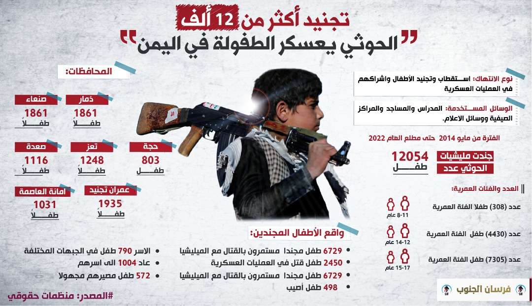 وحسب تقارير منظمات حقوقية انه خلال الفترة من مايو 2014 وحتى مطلع 2022جندت مليشات الحوثي عدد (12054) طفل بينهم عدد (308) طفلا مجندا ينتمون للفئة العمرية (8-11عام) وعدد (4430) طفل ينتمون للفئة العمرية (12-14عام) وعدد (7305) طفل ينتمون للفئة العمرية (15-17 عام).