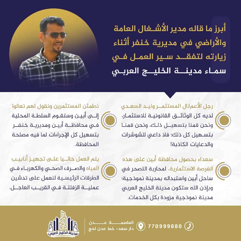 - سعداء بحصول محافظة أبين على هذه الفرصة الاستثمارية، لمحاربة التصحر في ساحل أبين واستبداله بمدينة نموذجية؛ وبإذن الله ستكون مدينة الخليج العربي مدينة نموذجية مزودة بكل الخدمات.