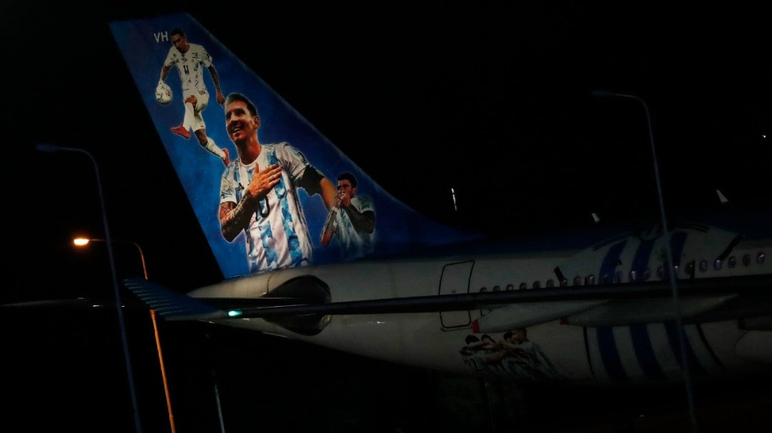ووضعت صورة لميسي على ذيل الطائرة مع عبارة "فريق واحد، بلد واحد، حلم واحد".