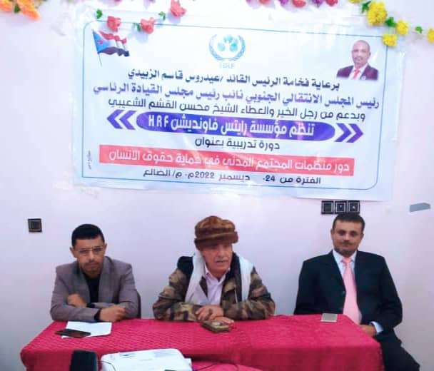 العميد عبدالله مهدي سعيد مؤكدا على اهمية انعقاد هذه الدورة والتي تاتي في مرحلة تحتاج الى تضافر الجهود لبناء القدرات للشباب وتأهيلهم ، مشيرآ بان دور منظمات المجتمع المدني هام جداً في حماية وتعزيز حقوق الانسان واكد بان المجلس الانتقالي الجنوبي يضع حقوق الانسان من اولوياته ، ويعمل على حمايتها وتعزيزها.