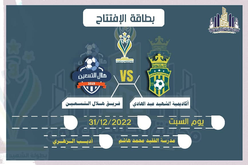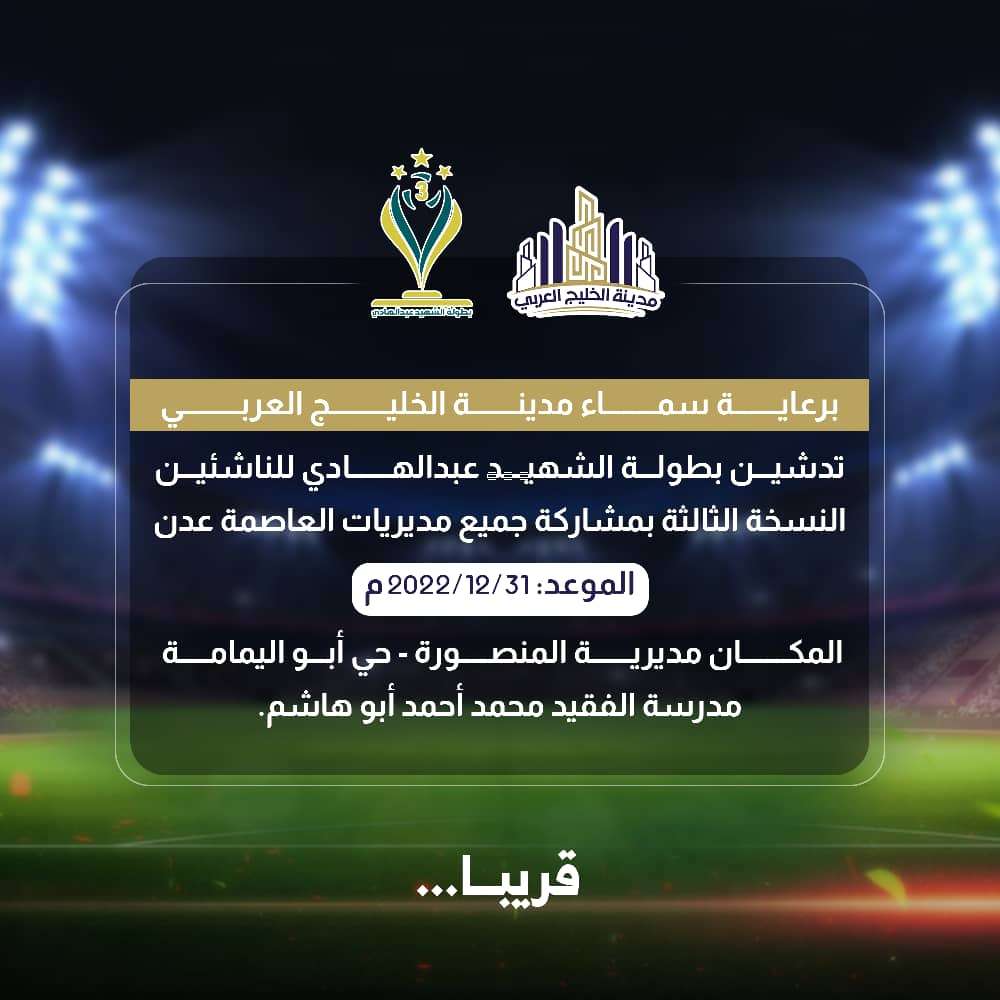 يترقب محبو وعشاق كرة القدم في العاصمة عدن وبتاريخ 31 ديسمبر إنطلاق بطولة الشهيد عبد الهادي محمد للنسخة الثالثة لفئة 2006/2007 لكرة القدم ، والذي يقام تحت إشراف اكاديمية الشهيد عبد الهادي ، وبرعاية سماء مدينة الخليج العربي لصاحبها رجل الاعمال وليد السعدي ، وبتنظيم كلا من الكابتن/عبدالرحمن عبدة والكابتن/صلاح الزهر والكابتن/اسامة عوض اللجنة ، حيث ستقام مباريات البطولة على ملعب مدرسة محمد هاشم الترابي في الهجرة مديرية المنصورة وملعب ثانوية النعمان الترابي بجانب سوق الخضرة المركزي مديرية المنصورة وبمشاركة 34 فريقا شعبيا من مختلف مديريات العاصمة عدن تلعب بنظام خروج المغلوب.