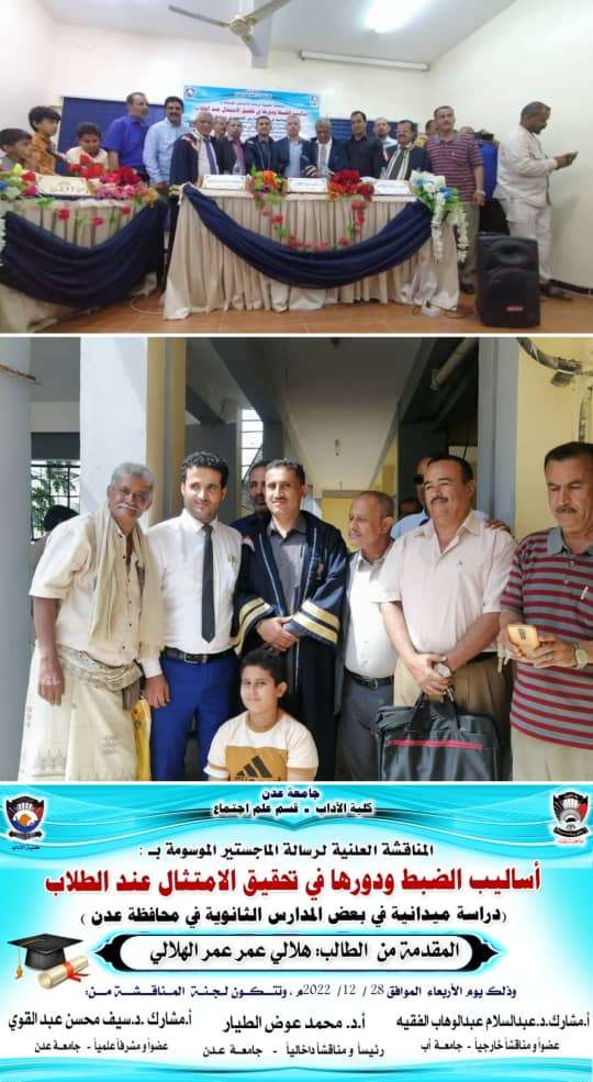 نال الباحث "هلالي عمر عمر الهلالي" اليوم، درجة الماجستير بامتياز من جامعة عدن كلية الآداب قسم علم الاجتماع، عن رسالته الموسومة (أساليب الضبط ودورها في تحقيق الامتثال عند الطلاب) دراسة ميدانية في بعض المدارس الثانوية في محافظة عدن