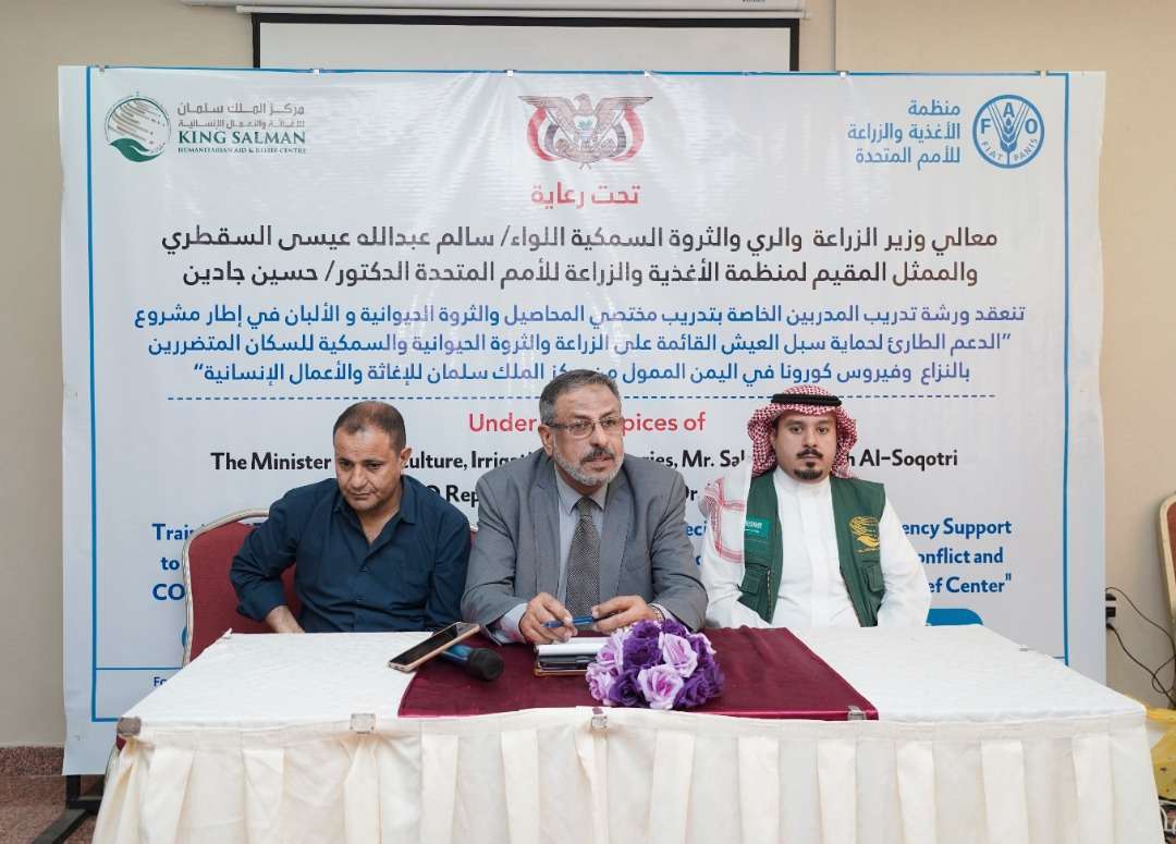 بدعم من مركز الملك سلمان للإغاثة والأعمال الإنسانية، اُختتمت أمس في عدن الدورة التدريبية الخاصة بالمحاصيل الزراعية والثروة الحيوانية ضمن مشروع المساعدات الطارئة لتحسين سبل العيش للسكان المتضررين من النزاع وفيروس كورونا، الذي تنفذه منظمة الأغذية والزراعة (الفاو) بالتنسيق مع وزارة الزراعة والري والثروة السمكية في اليمن.