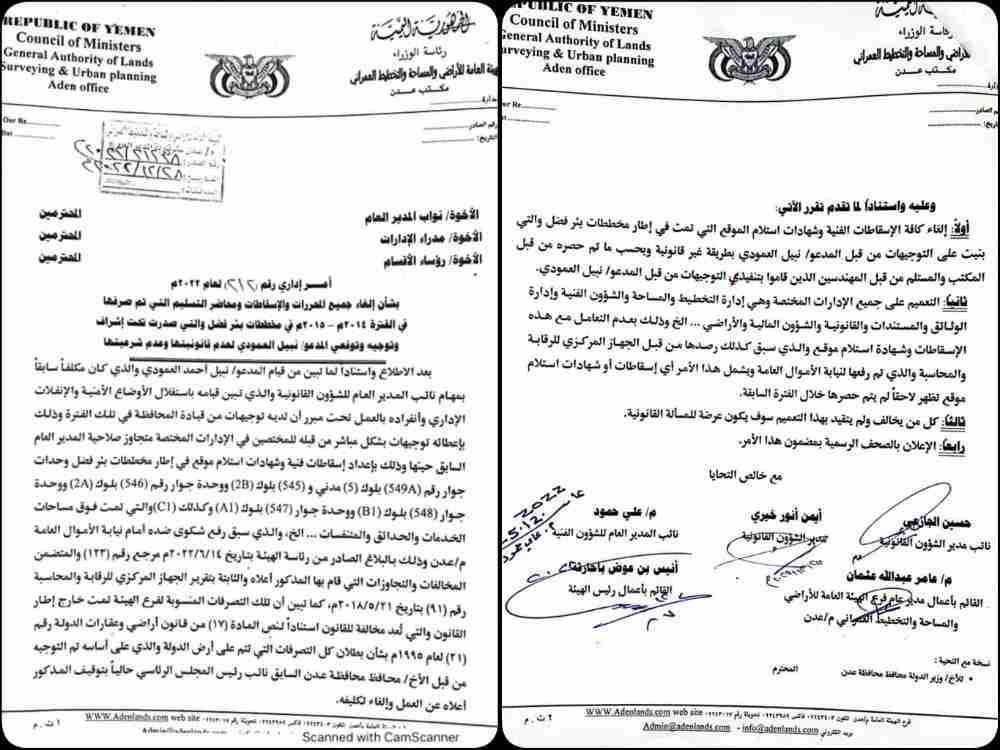 بعد الإطلاع واستنادا لما تبين من قيام المدعو نبيل العمودي والذي كان مكلفا سابقا بمهام نائب المدير العام للشؤون القانونية والذي تبين قيامه باستغلال الأوضاع الأمنية والانفلات الإداري وانفراده بالعمل تحت مبرر أن لديه توجيهات من قيادة المحافظة في تلك الفترة وذلك بإعطائه توجيهات بشكل مباشر من قبله للمختصين في الإدارات المختصة متجاوزا صلاحية المدير العام السابق حينها وذلك بإعداد اسقاطات فنية وشهادات استلام موقع في إطار مخططات بئر فضل وحدات جوار رقم A549 بلوك 5 مدني و 545 بلوك 2B ووحدة جوار رقم 546 بلوك 2A ووحدة جوار 548 بلوك 1B ووحدة جوار رقم 547 بلوك 1A وكذلك 1C والتي تمت فوق مساحات الخدمات والحدائق والمتنفسات..إلخ، والذي سبق رفع شكوى ضده أمام نيابة الأموال العامة م.عدن وذلك بالبلاغ الصادر من رئاسة الهيئة بتاريخ ١٤/٦/٢٠٢٢ مرجع رقم (١٢٣) والمتضمن المخالفات والتجاوزات التي قام بها المذكور أعلاه والثابتة بتقرير الجهاز المركزي للرقابة والمحاسبة رقم (٩١) بتاريخ ٢١/٥/٢٠١٨ ، كما تبين أن تلك التصرفات المنسوبة لفرع الهيئة تمت خارج إطار القانون والتي تعد مخالفة للقانون استنادا لنص المادة (١٧) من قانون أراضي وعقارات الدولة رقم (٢١) لعام ١٩٩٥م بشأن بطلان كل التصرفات التي تتم على أرض الدولة والذي على أساسه تم التوجيه من قبل الأخ محافظ محافظة عدن السابق نائب رئيس المجلس الرئاسي حاليا بتوقيف المذكور أعلاه عن العمل وإلغاء تكليفه.