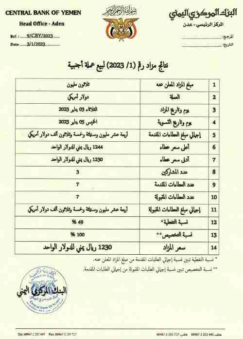 أعلن البنك المركزي اليمني، أمس الثلاثاء، نتائج المزاد رقم 1 لعام 2023 لبيع عملة أجنبية، والذي أعلن عنه يوم الخميس الماضي.