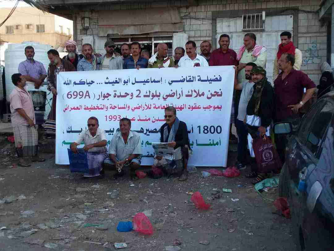 وعبر المحتجون بلافته ورد فيها فضيلة القاضي اسماعيل ابو الغيث حياكم الله (نحن ملاك اراضي بلوك 2 وحدة جوار (699A)بموجب عقود الهيئة العامة للأراضي والمساحة والتخطيط العمراني محافظة عدن منذو عام 1993م أن ما يقارب الف وثمان مائه أسرة مصيرهم بين يديك وأملنا بالله ثم بعدلكم وانصافكم لنا.