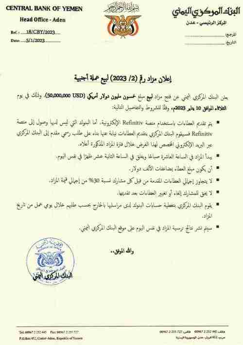 يعلن البنك المركزي اليمني عن فتح مزاد لبيع مبلغ خمسون مليون دولار أمريكي (50,000,000 USD)، وذلك في يوم الثلاثاء الموافق 10 يناير 2023م، وفقًا للشروط والتفاصيل التالية: