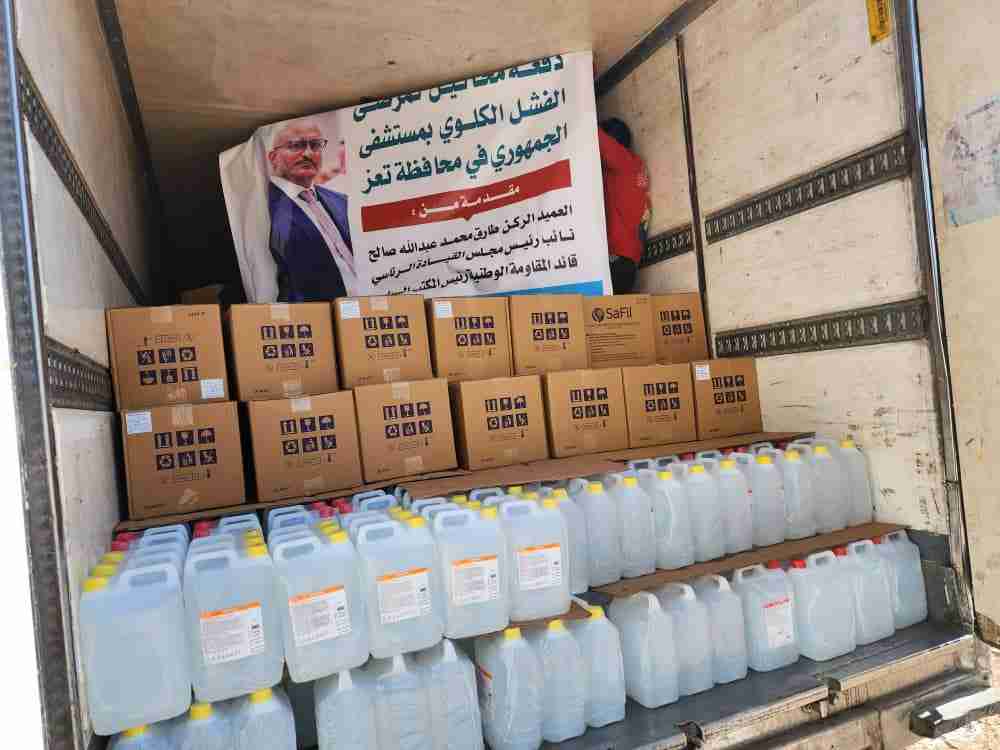 وتكفل العميد الركن طارق صالح بدعم مركز الغسيل في المستشفى الجمهوري بمحافظة تعز بدفعة من المحاليل الخاصة بمرضى الفشل الكلوي، حيث تحتوي الشحنة على ألفي جلسة غسيل والتي من شأنها إنقاذ حياة المئات من مرضى الفشل الكلوي.