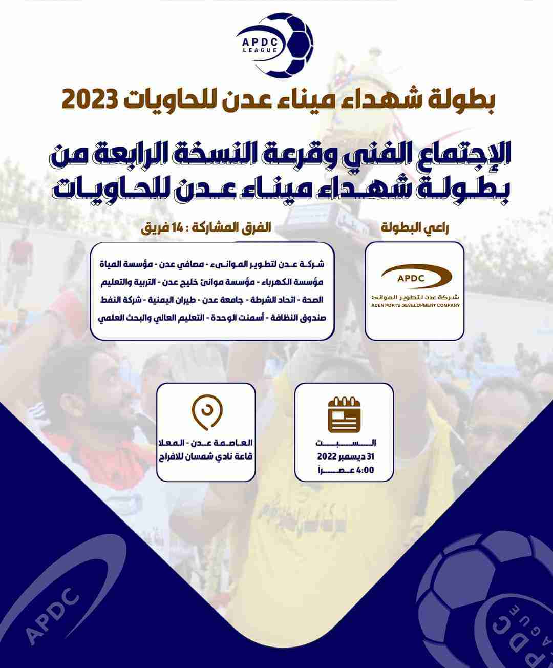 تنطلق عصر غدا السبت بطولة شهداء ميناء الحاويات "عدن" حيث تشهد ملاعب فن سيتي مباراة الإفتتاح لهذه البطولة التي تقام بنسختها الرابعة وفاءاً للشهداء الاماجد وتخليداً لذكراهم.