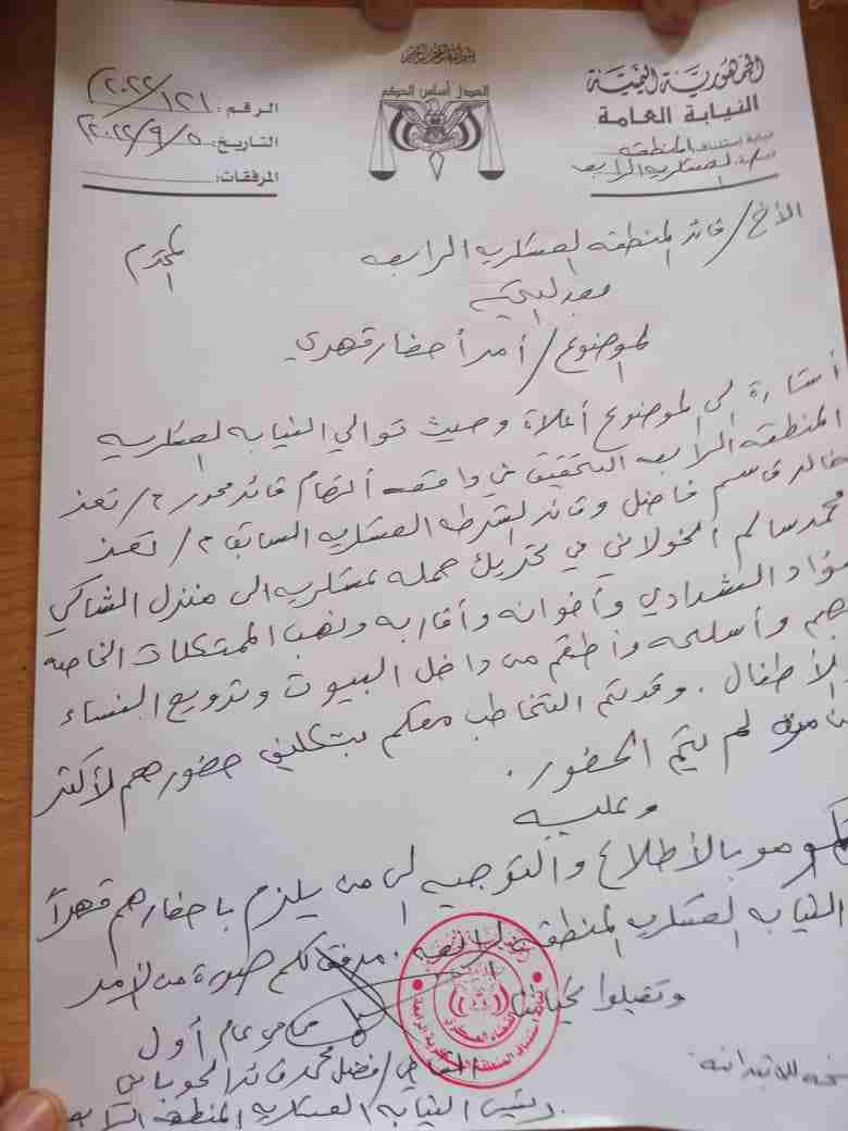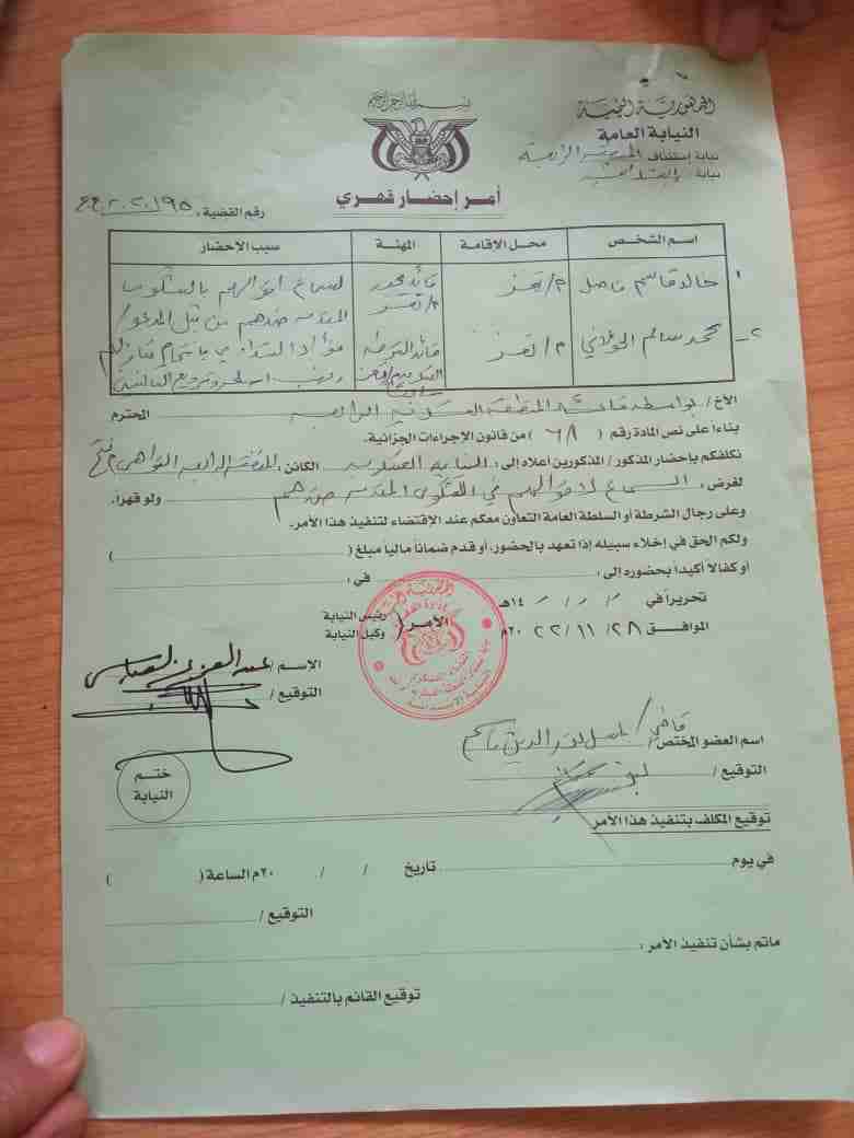أصدرت النيابة العسكرية بالمنطقة العسكرية الرابعة أوامر قبض قهرية في حق قائد محور تعز خالد فاضل وقائد الشرطة العسكرية السابق محمد سالم الخولاني بعد ان رفضا الحضور امامها للتحقيق معهما بتهمة اقتحام منزل فؤاد الشدادي قائد مقاومة الحجرية واخوانه ومنزل العقيد عبد الحكيم الجبزي رئيس عمليات اللواء35 سابقا