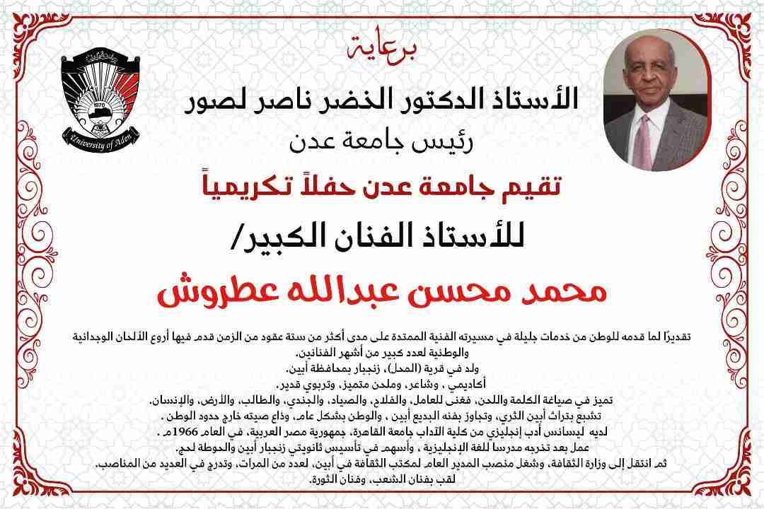برعاية رئيس جامعة عدن الأستاذ الدكتور الخضر ناصر لصور، تنظم جامعة عدن حفل تكريم للهامة الفنية والأكاديمية والتربوية الفنان محمد محسن عبدالله عطروش، يوم الأربعاء القادم 11يناير 2023م، بقاعة إبن خلدون كلية الآداب جامعة عدن، بمديرية خور مكسر العاصمة عدن.