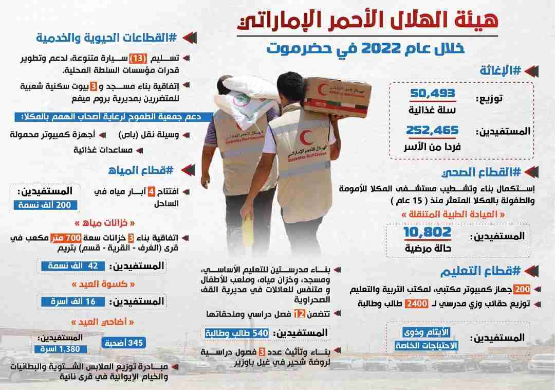 نفذت هيئة الهلال الأحمر الإماراتي سلسلة من المشاريع والمبادرات النبيلة، في محافظة حضرموت، ومديرياتها وقراها، خلال عام 2022، وتنوعت حزمة المشاريع بين الإنسانية و الإغاثية والتنموية والصحية والمجتمعية ومشاريع المياه والبنى التحتية والتي شملت معظم احتياجات المواطنين.