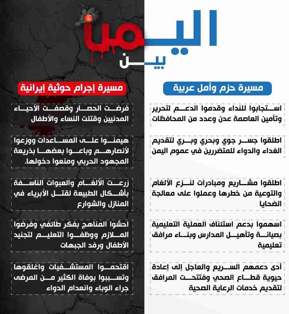 اليمن بين مسيرة إجرام حوثية إيرانية وعاصفة حزم وأمل عربية(انفوجرافيك)